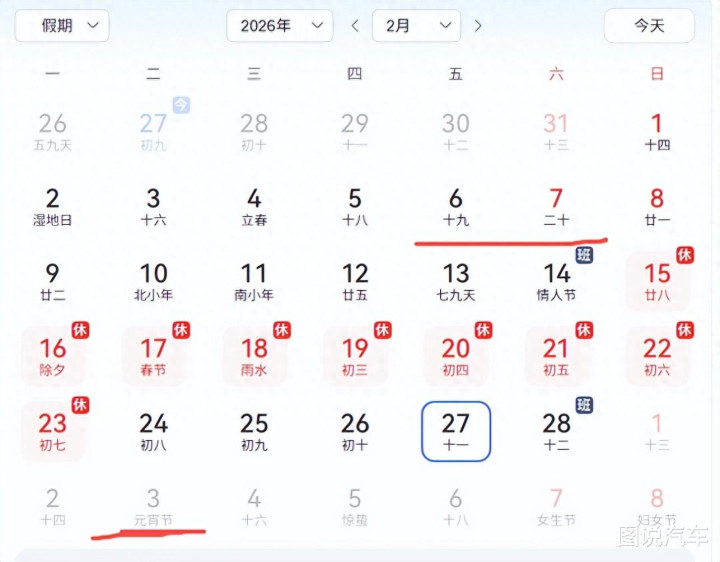 有东说念主总是苦恼,为啥好多车都要比及三月?来给你一张日期截图你就懂了。可以说,从2月6号傍边,好多公司好多厂都要休假了,本年责任日也就剩下十几天了,关于好多务工东说念主员的确如斯,菟裘归计,这个时候至少这一部分东说念主是没空关注啥了,而关于经销商,也将濒临一年来最冷场的日子。