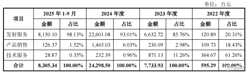 中科宇航主营业务收入主要来自于放射处事、居品销售和技巧处事。报告期各期,放射处事收入占当期主营业务收入的比例分别为20.31%、85.76%、93.01%和98.13%。