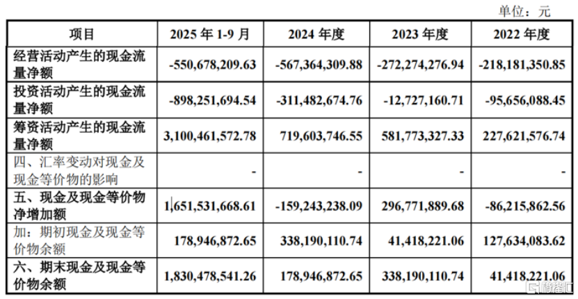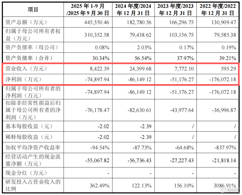 2022年、2023年、2024年及2025年1-9月(报告期),公司的收入分别为595.29万元、7772.1万元、2.44亿元、8422.39万元,归母净利润分别为-17.61亿元、-5.12亿元、-8.61亿元和-7.49亿元,报告期内累计失掉38.83亿元。