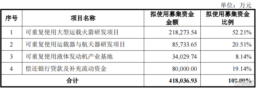 中科宇航这次筹备募资41.8亿元,将用于可相易使用大型输送火箭研发名目、可相易使用输送器与航天器研发名目、可相易使用液体发动机产业基地、偿还银行贷款及补充流动资金。