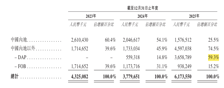 大金重工主营海优势电基础装备,包括单桩、过渡段、导管架、浮式基础及塔筒。频年最彰着的变化是托福格式升级——从传统的FOB(船上交货)转向DAP(接洽地交货)。2025年,全年DAP格式托福的国外收入36.59亿元,占国外总收入45.97亿元的79.6%。