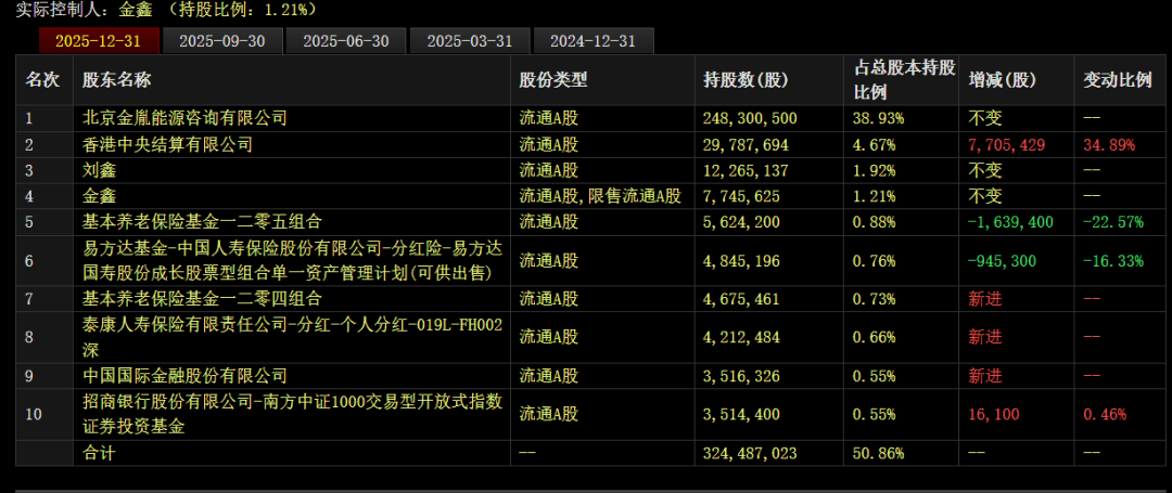 大金重工首创东谈主金鑫先生通过胜利持股和全资控股的金胤动力,统统持有公司约40.15%的股份。此外,手脚大金重工的第一大当然东谈主鼓动,摒弃2025年底,刘鑫持股约1226.51万股,持股比例约1.92%,位列第三大鼓动。
