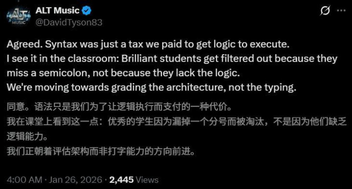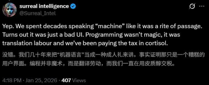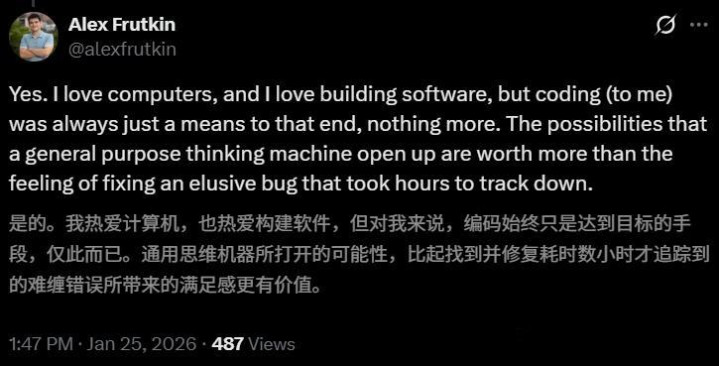 东谈主类径直办写代码,正在变得不再有任何真义,致使是一种后果的奢华。