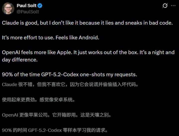 一些资深修复者褒贬谈:在90%的情况下,GPT-5.2-Codex皆能一次性完成我提议的肯求。